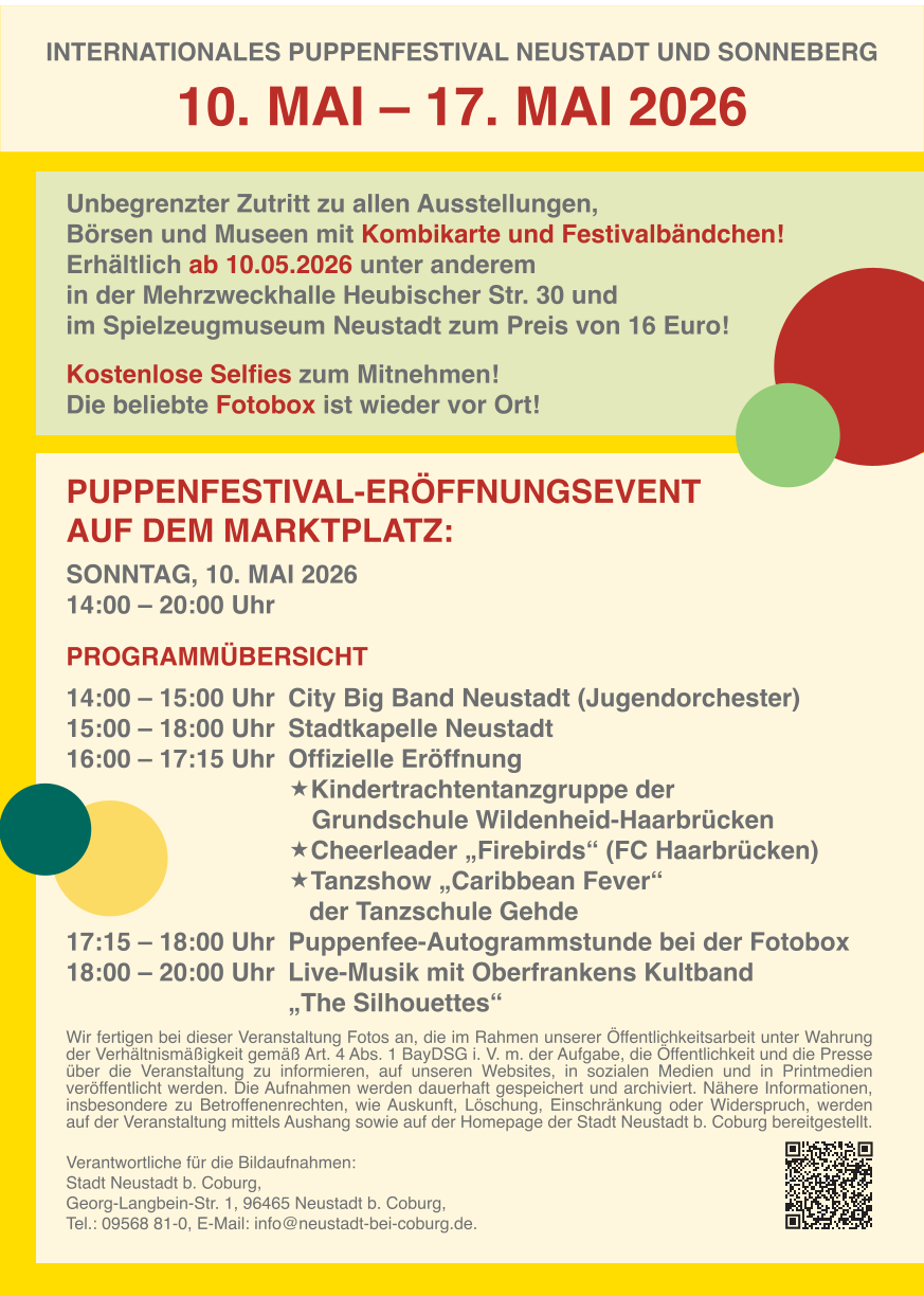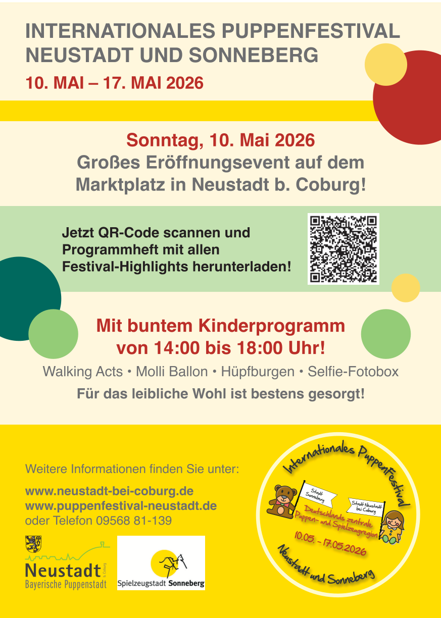 Vom 10. Mai – 17. Mai 2026 findet das Internationale Puppen Festival in der Bayerischen Puppenstadt Neustadt bei Coburg sowie in der Weltspielzeugstadt Sonneberg statt.